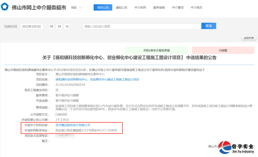 2022年3月,廣東省佛山市高明區楊和鎮城建綜合事務中心通過佛山市網上中介服務超市進行公開選取并經過項目業主確認,確定信宇騰遠規劃設計有限公司中選楊和鎮科技創新孵化中心、創業孵化中心建設工程施工圖設計項目(采購項目編碼:ZC2022(GM)ZX00154)。