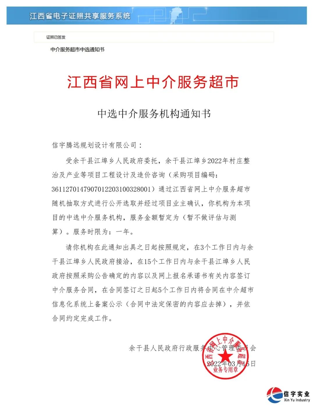 2022年3月,信宇騰遠規劃設計有限公司通過江西省網上中介服務超市進行公開選取并經過項目業主確認,中選余干縣江埠鄉2022年村莊整治及產業等項目工程設計及造價咨詢(工程設計,工程造價咨詢)項目。