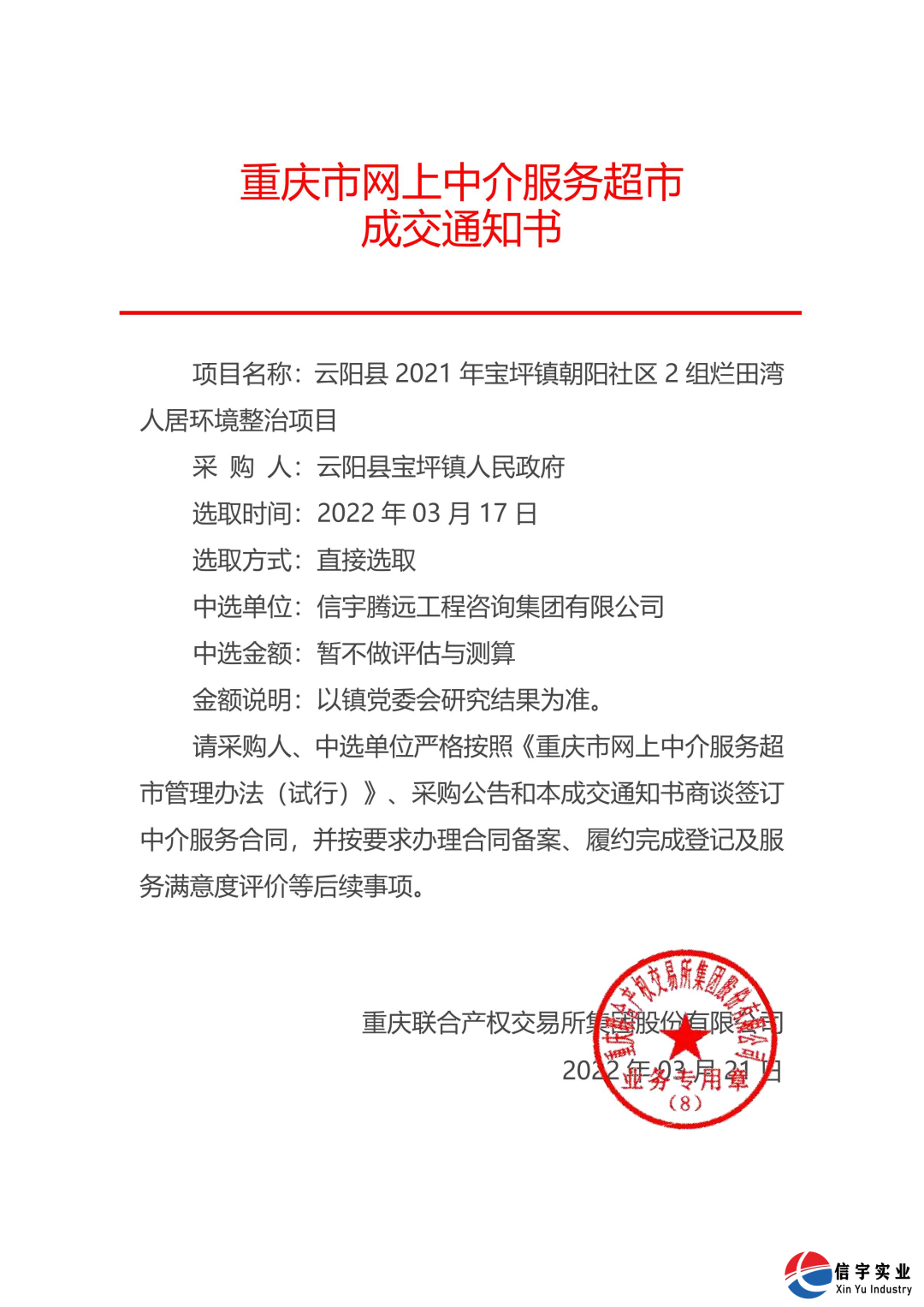 2022年3月,信宇騰遠工程咨詢集團有限公司通過重慶市網上中介服務超市進行公開選取并經過項目業主確認,中選云陽縣2021年寶坪鎮朝陽社區2組爛田灣人居環境整治項目(工程監理)。