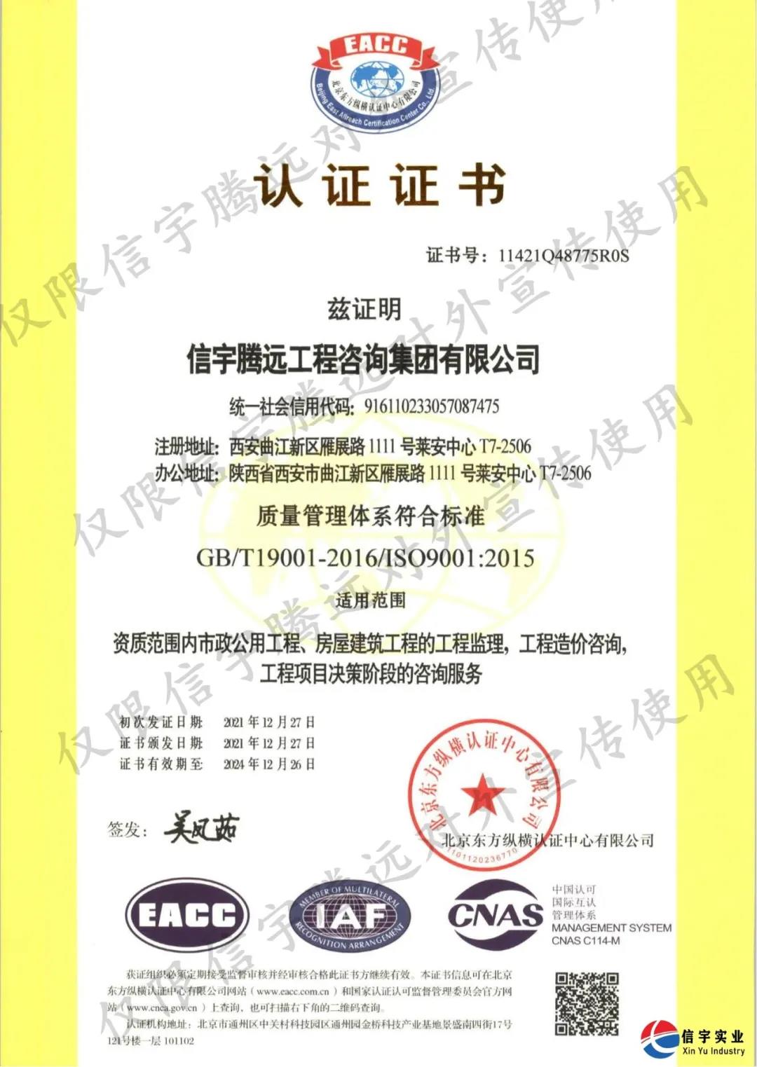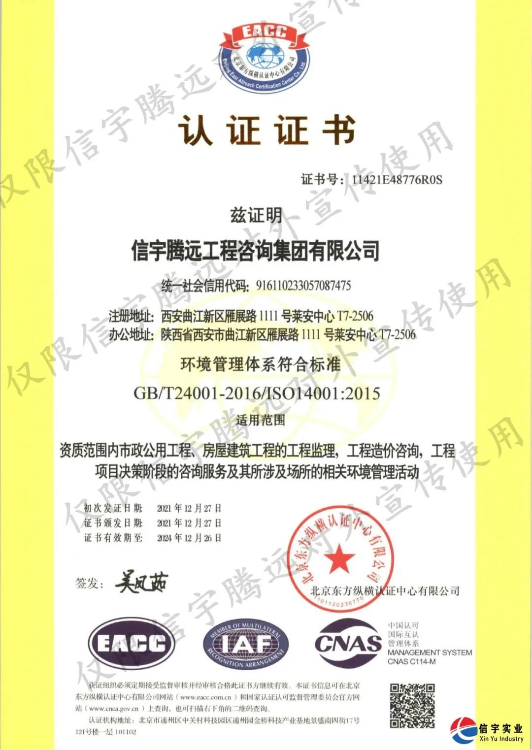 恭賀信宇騰遠(yuǎn)工程咨詢集團(tuán)有限公司順利通過ISO9001質(zhì)量管理體系、ISO14001環(huán)境管理體系、ISO45001職業(yè)健康安全管理體系“三體系”認(rèn)證,并獲得三體系認(rèn)證證書。