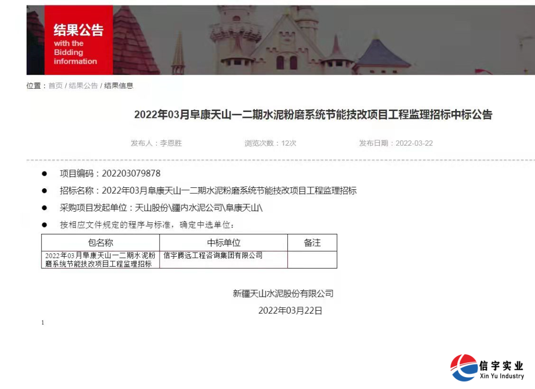 2022年3月,新疆天山水泥股份有限公司阜康天山一二期水泥粉磨系統(tǒng)節(jié)能技改項目工程監(jiān)理招標進行公開招標,經(jīng)評審專家綜合評審,采購人確認,確定信宇騰遠工程咨詢集團有限公司中標2022年3月阜康天山一二期水泥粉磨系統(tǒng)節(jié)能技改項目工程監(jiān)理招標。