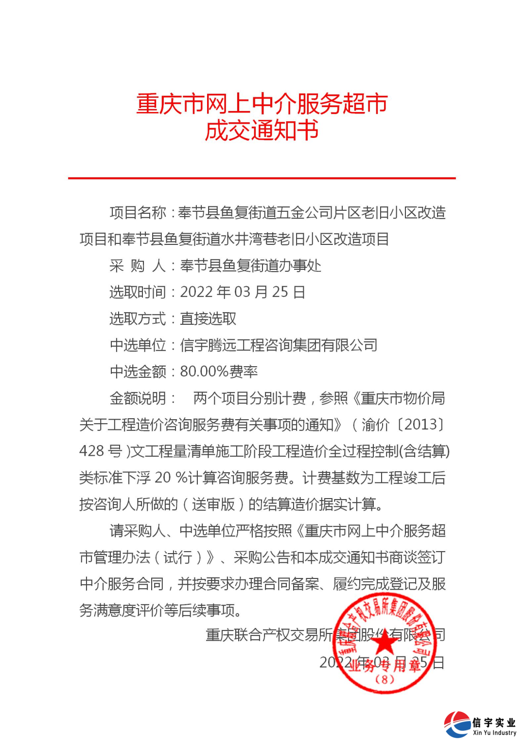 2022年3月,信宇騰遠工程咨詢集團有限公司通過重慶市網上中介服務超市進行公開選取并經過項目業主確認,中選奉節縣魚復街道五金公司片區老舊小區改造項目和奉節縣魚復街道水井灣巷老舊小區改造項目(工程造價咨詢)。